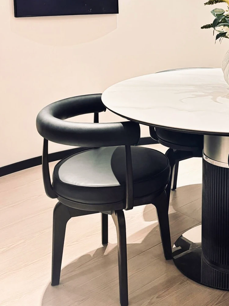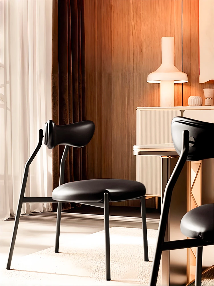 イタリアンミニマルデザインのヴィンテージ風ダイニングチェア - 自宅用、ソフトレザー背もたれ付き、モダンシンプルなスタイル、リラックスできるブラックカラーのデスクチェア。おしゃれで快適な食卓を演出!