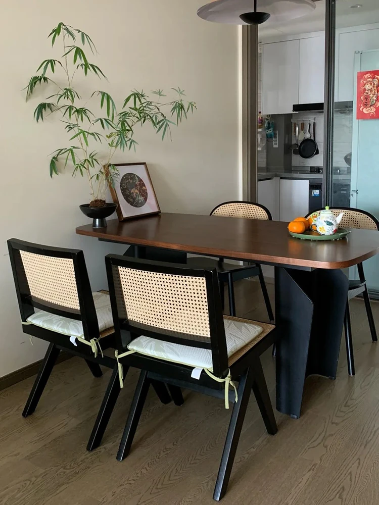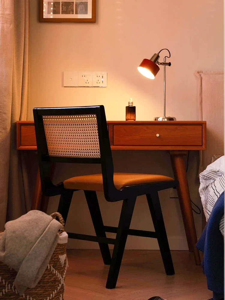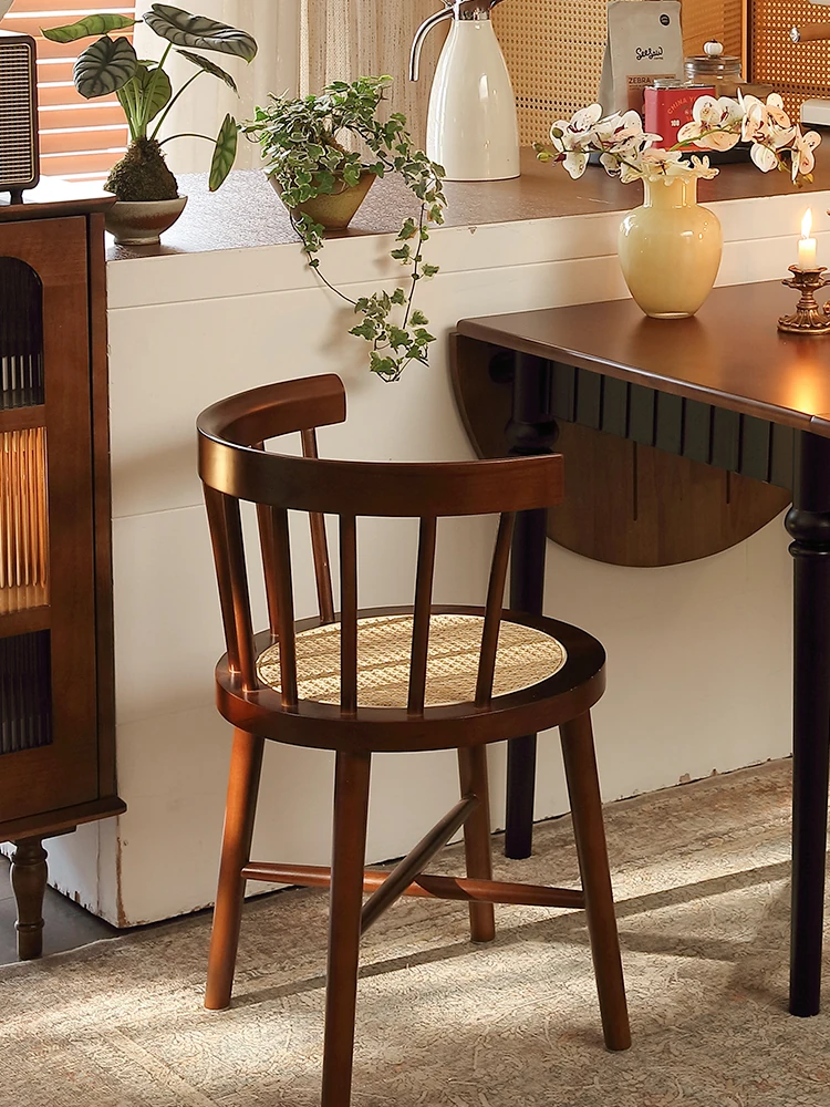 レトロな無垢材ダイニングチェアと中華風ダイニングテーブルセット、背もたれ付きのラタン編みウィンザーチェア。女性の化粧台やカフェにぴったりな、おしゃれで使いやすいアイテムです!