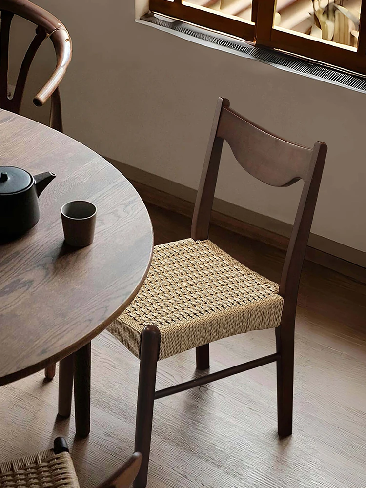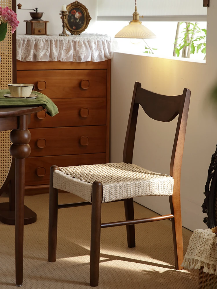 ヴィンテージ風の無垢材ダイニングチェア - 家庭用にぴったり!レトロな背もたれと書斎にも合うデザイン、籐編みのウォールナットコーヒーカラーで、侘び寂びの美しさを演出。リラックスしたひとときをお楽しみください。