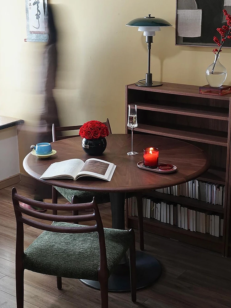 ヴィンテージスタイルの無垢材ダイニングテーブルとバウハウス風のレザー背もたれチェアセット!一人用のリラックスできるレトロなデスクやティーチェア、化粧スツールも完備。快適な空間を演出し、心地よいひと時をお楽しみください!