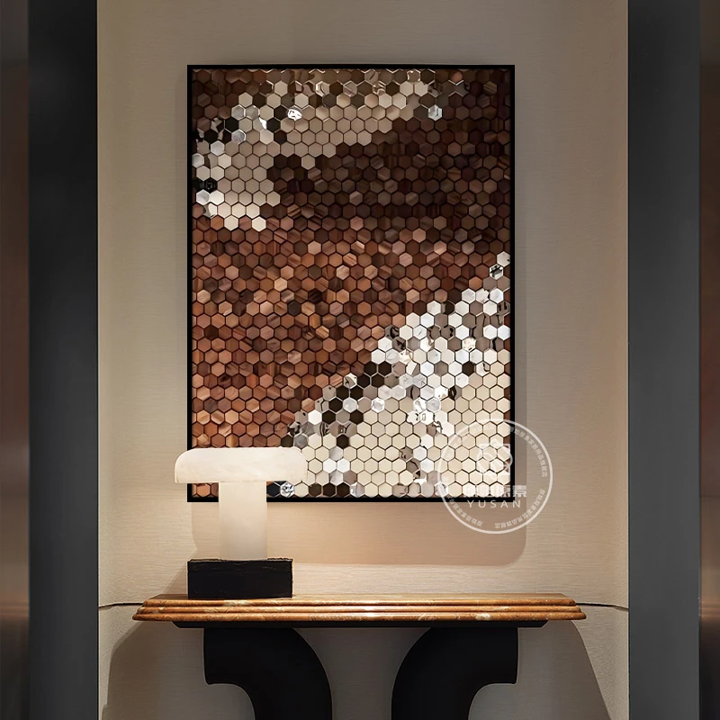 ラグジュアリーな立体アート装飾画 六角形モザイクの天然木と金属製の掛け画 サンプルルームにもぴったりな抽象的なインスタレーションアート!あなたの空間を洗練された雰囲気に演出します。