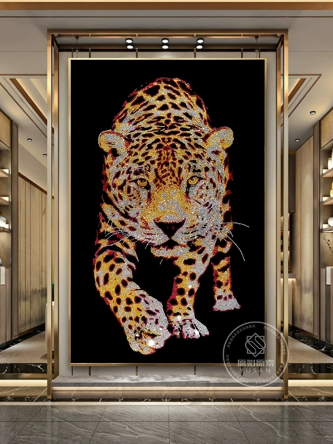 ラグジュアリーな金色ヒョウの装飾画!クリスタルとダイヤモンドをあしらった立体的なアート作品。高級感あふれる玄関やリビングにぴったり。洗練されたデザインでお部屋を華やかに演出します!