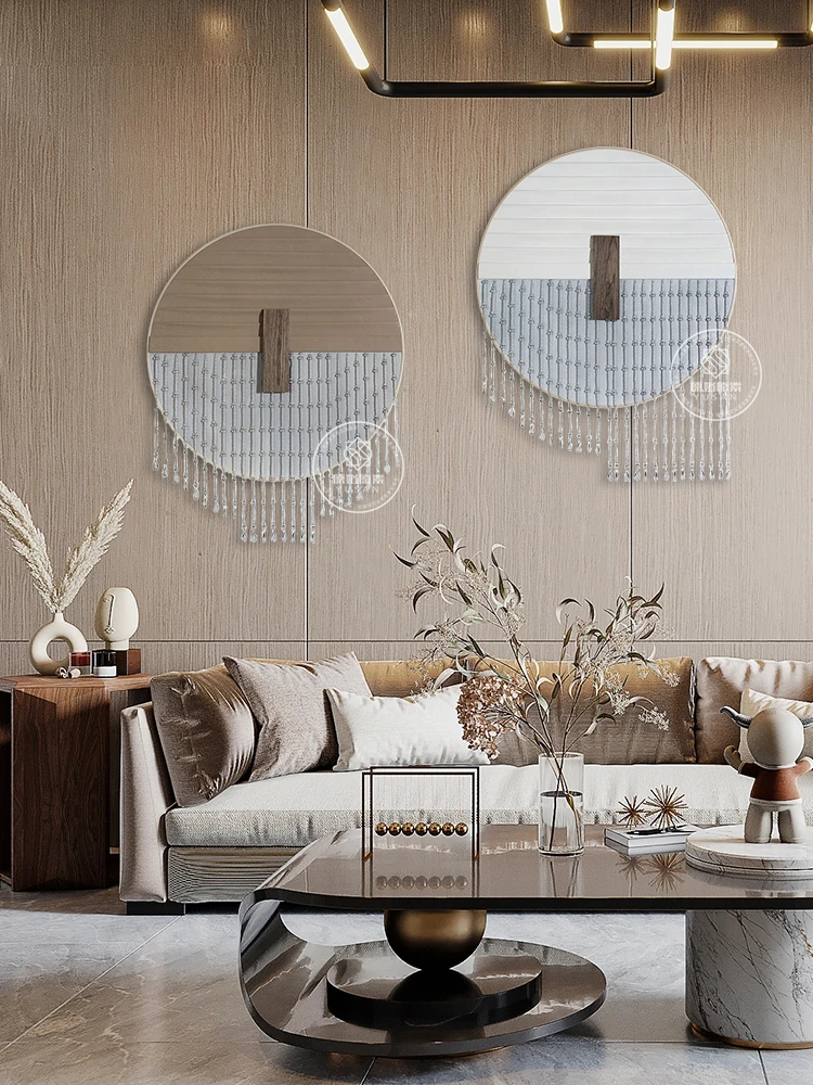 モダンミニマルビーズ装飾高級レザー立体壁画 - 丸型デザインでエレガントな玄関や寝室に最適なアート!洗練されたインテリアを演出し、空間に特別なアクセントを加えます。