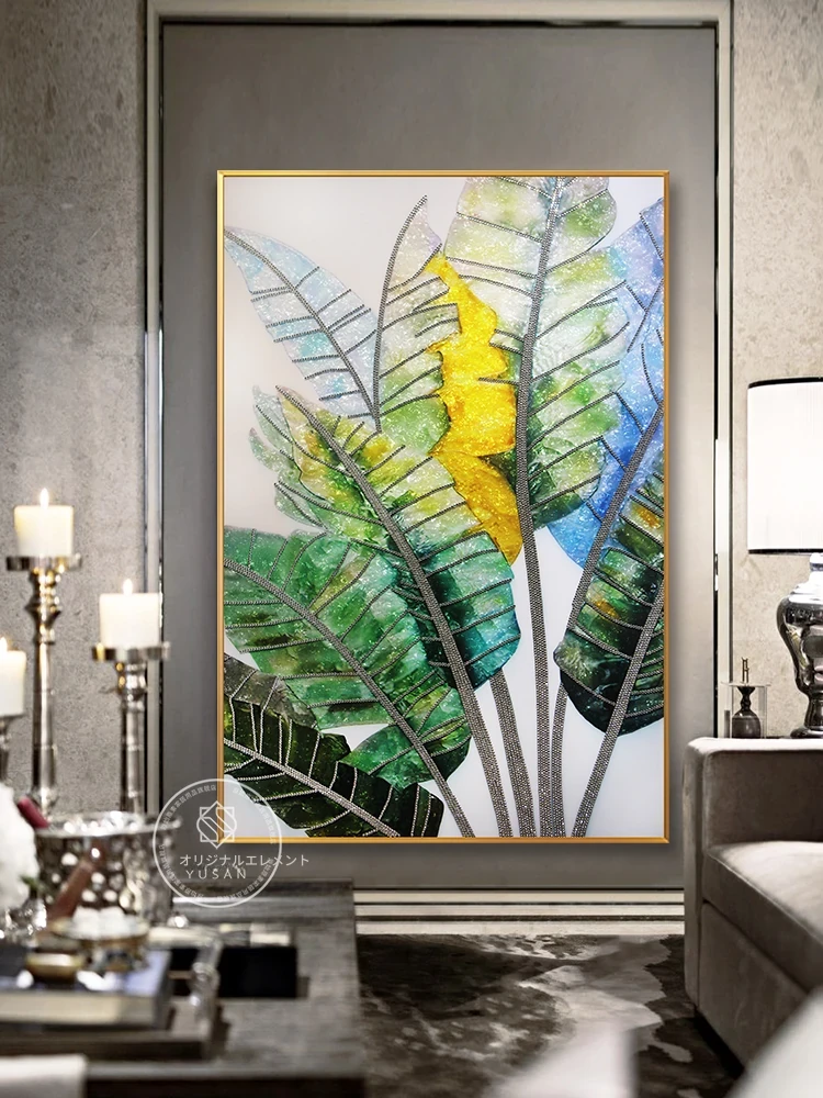リビングルーム装飾画 クリスタルダイヤモンド立体バナナツリーウォールアート 高級感あふれる玄関用縦型デザイン 家庭の繁栄を象徴する美しい装飾画