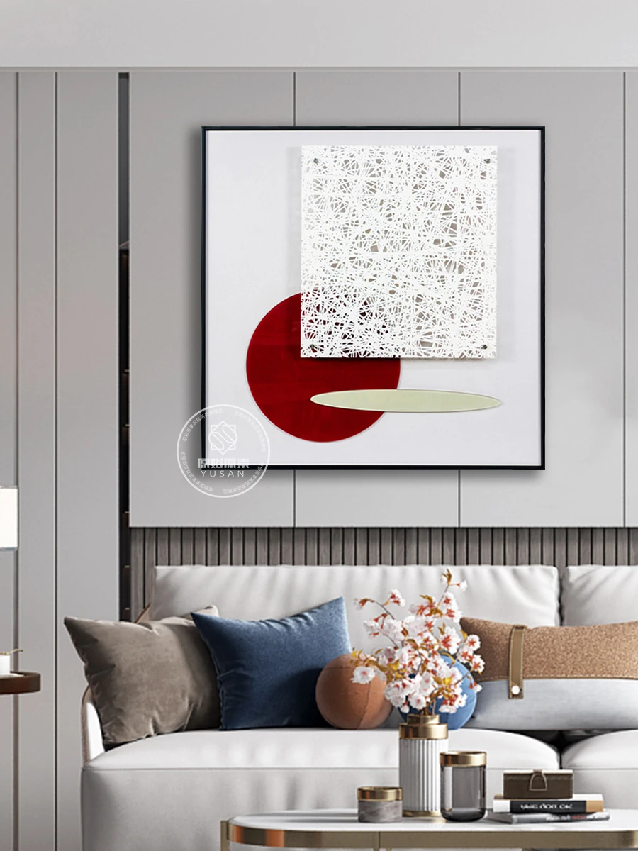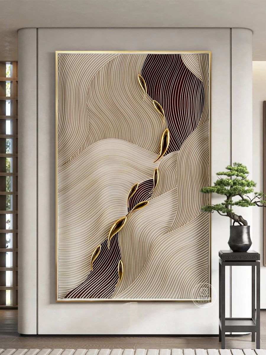 新中式テクスチャー手描きアート、禅の雰囲気を醸し出すリビングソファ背景壁掛けアート、立体彫刻デザイン、洗練されたサンプルルーム用のデザイナーアート。心を癒す空間を演出!