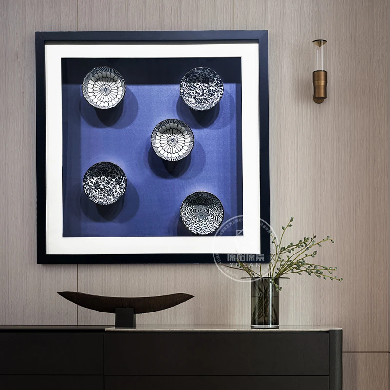 新中式リビングルーム用組み合わせ掛け画と陶器茶碗の青花瓷装飾画 - おしゃれな茶室や書斎にぴったりの四角い壁画で、和の美しさを引き立てます。