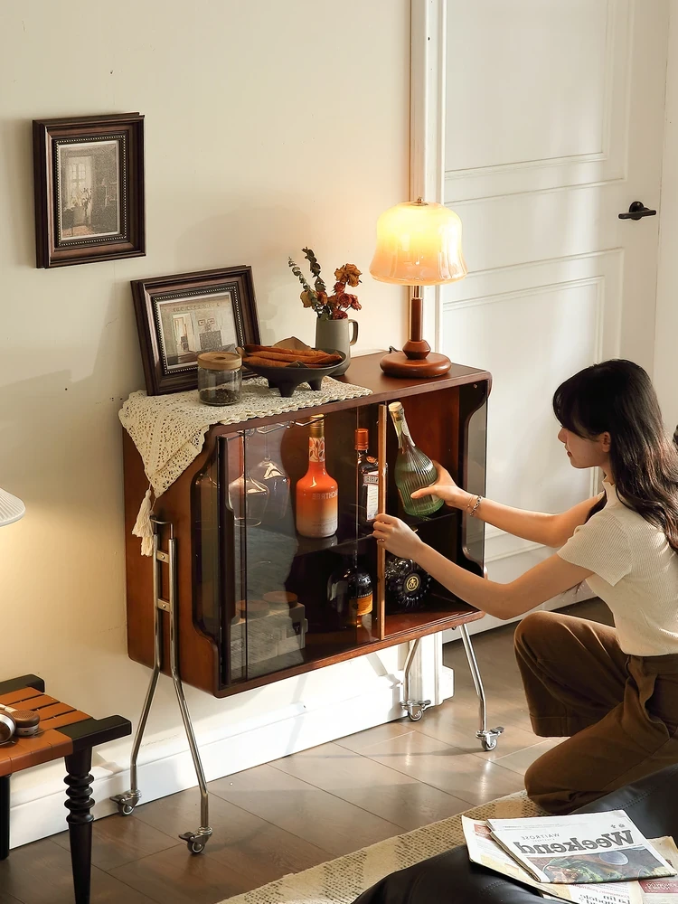 Vintage-Style Movable Glass Wine Cabinet - Cherry Solid Wood Sideboard, Perfect for Sofa or Hallway Storage, Stylish Entryway Organizer and Display Shelf