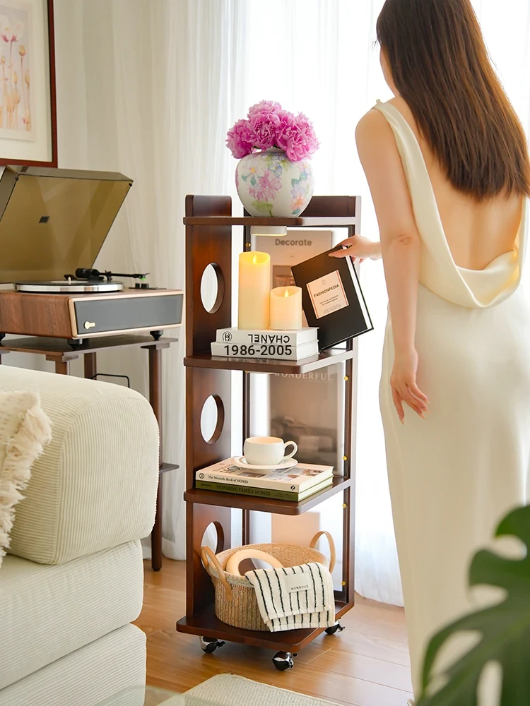 Vintage Solid Wood Movable Bookshelf with Wheels - Corner Cabinet for Sofa, Rustic Floor Storage Rack, Retro Nightstand for Home Décor