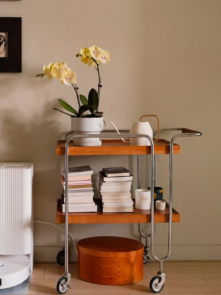 Vintage Solid Wood Rolling Cart - Retro Stainless Steel Dining Trolley for Living Room, Stylish and Functional Mobile Side Table, Perfect for Home Décor and Organization