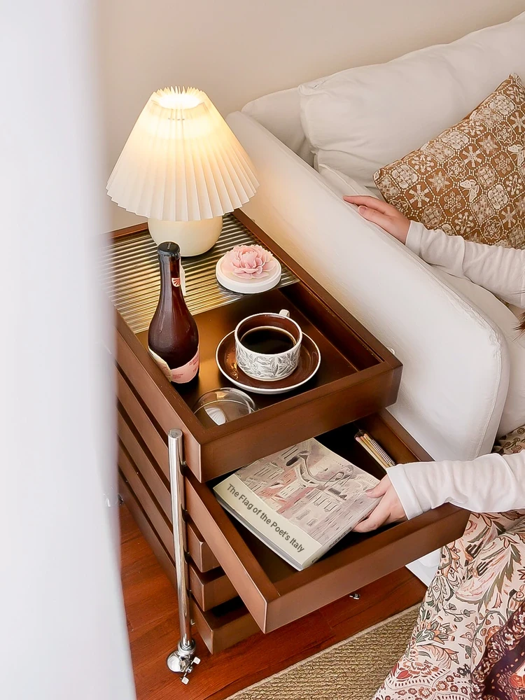 Vintage Solid Wood Side Table with Wheels - Versatile Sofa Side Cart, Nightstand, Storage Rack, and Snack Trolley for Living Room and Bedroom Use