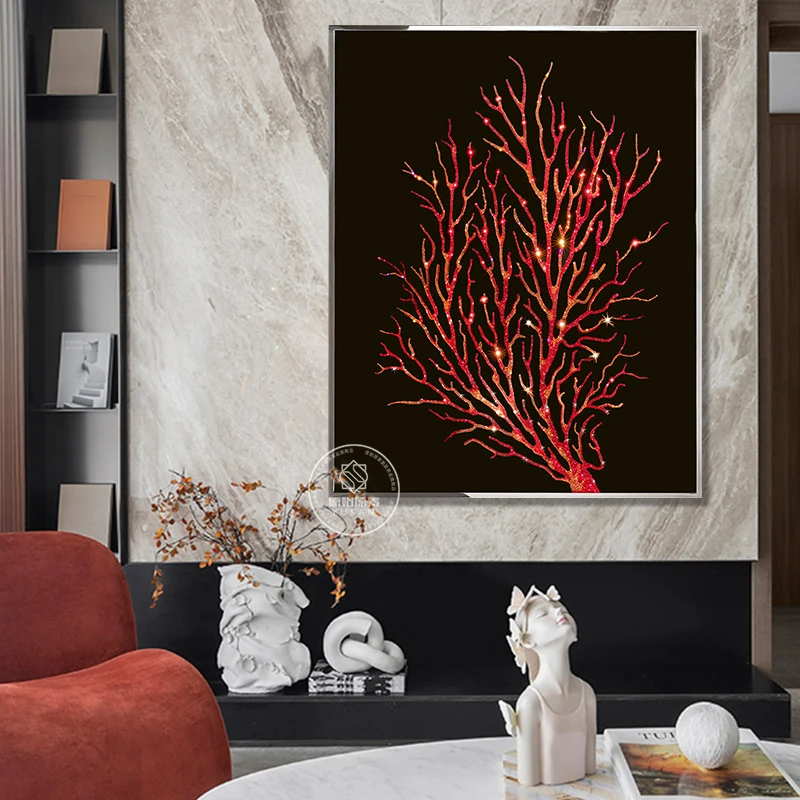 Modern Chic Decorative Wall Art - Red Coral Diamond-Studded Vertical Floor Hanging Painting for Entryway and Living Room Sofa, Elevate Your Space with Luxury Elegance