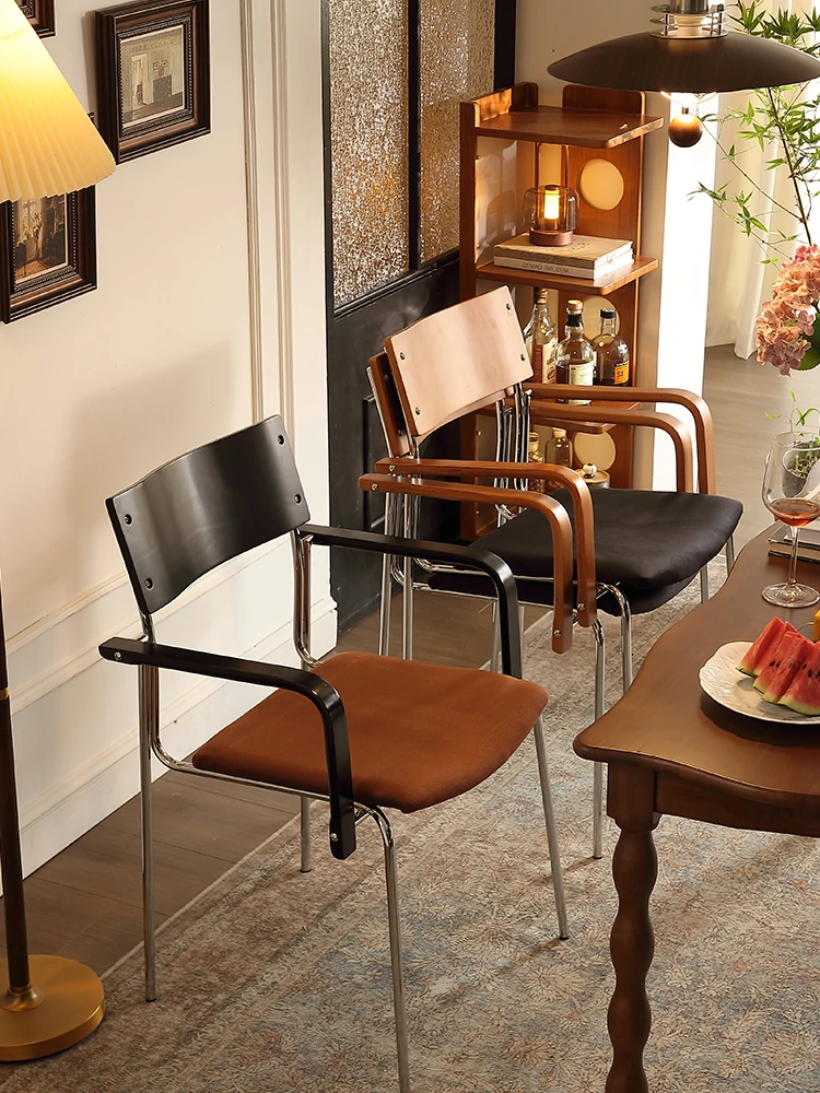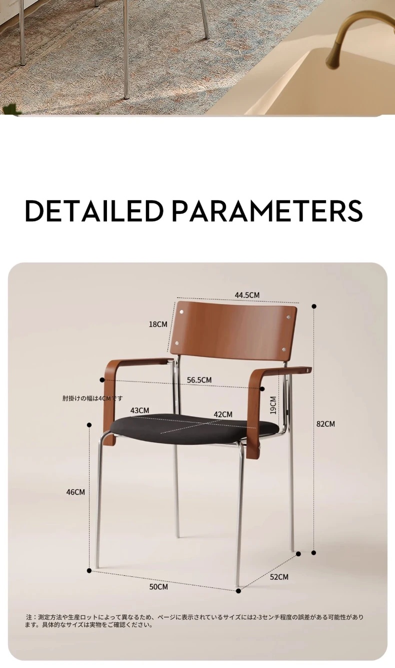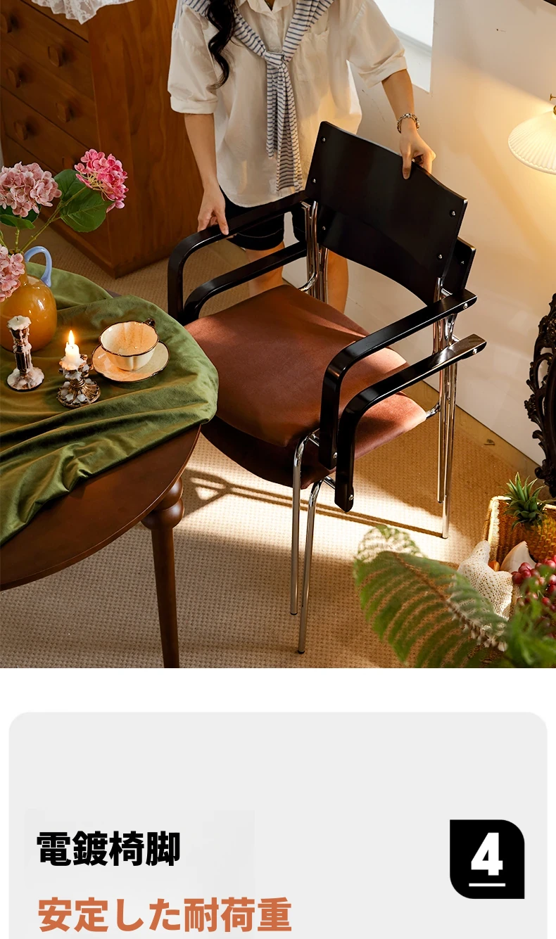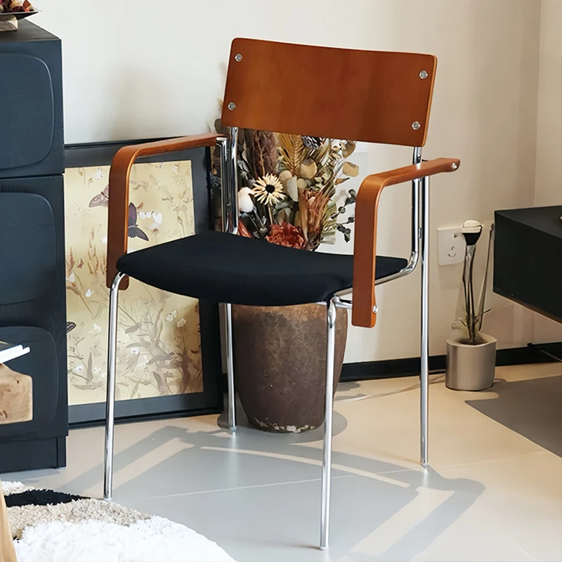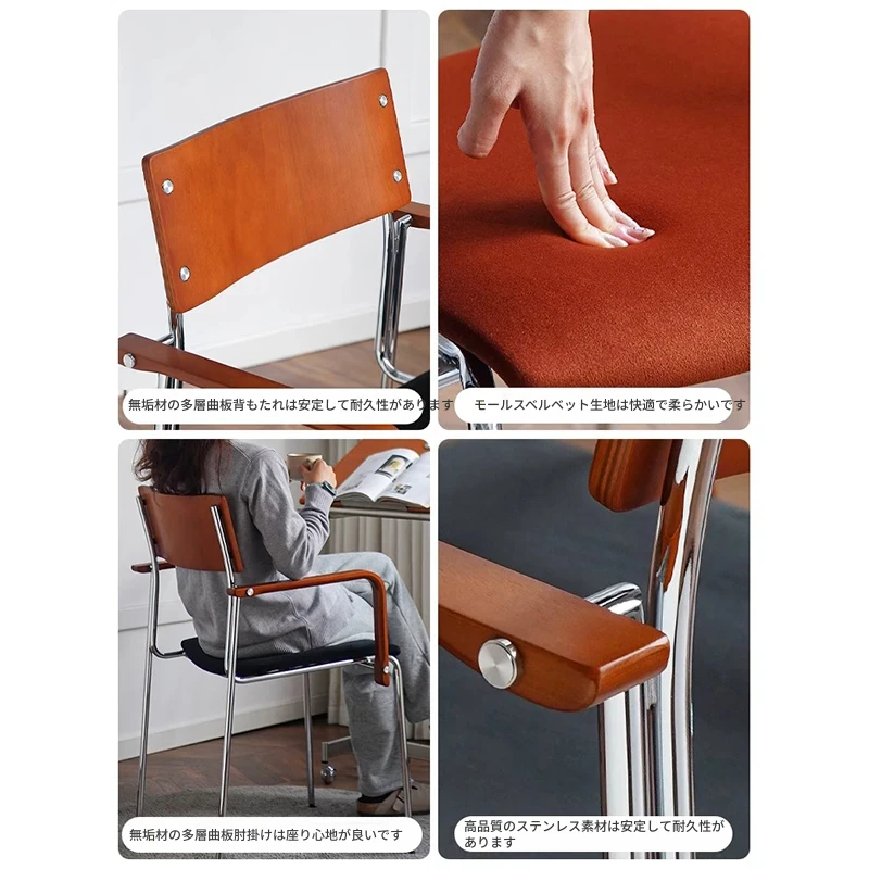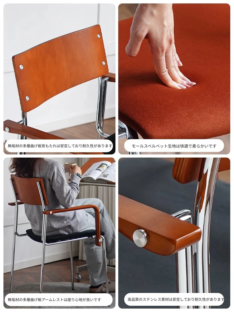 中古風バウハウスデザインのスタッキングダイニングチェア|家庭用|木製の背もたれとアームレスト付き|快適なソフトシート|耐久性のあるステンレススチール製|おしゃれで実用的な書斎やダイニングに最適!