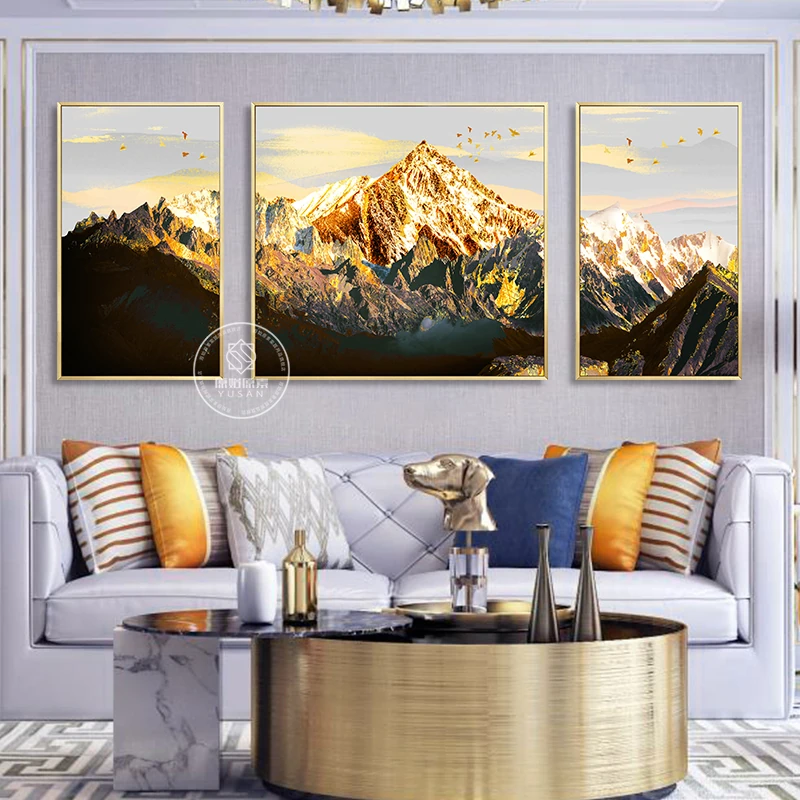 ラグジュアリーなリビングルームにピッタリ!三連装飾画「日照金山」横版デザイン、金箔と水晶の輝きで運気を呼び込む!高級感溢れる壁画、ホテルや自宅のインテリアに最適です。