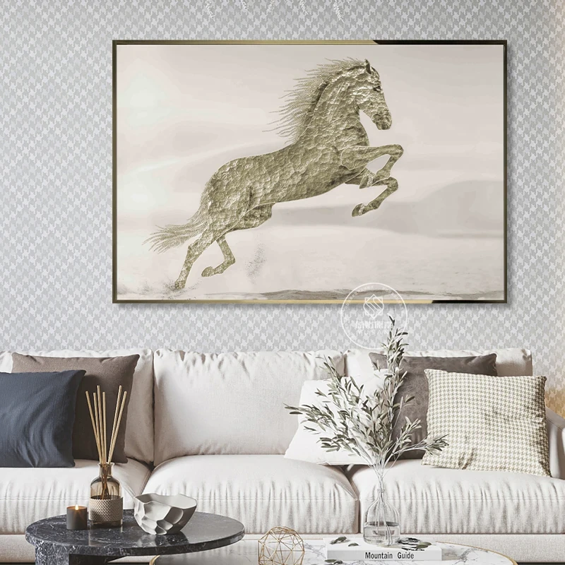 ラグジュアリーな客間にぴったり!クリスタル装飾画「馬」の玄関掛け絵で、ソファの背景に高級感を演出。ゴールドの輝きが魅力的な壁画で、大人の空間を更に引き立てます。