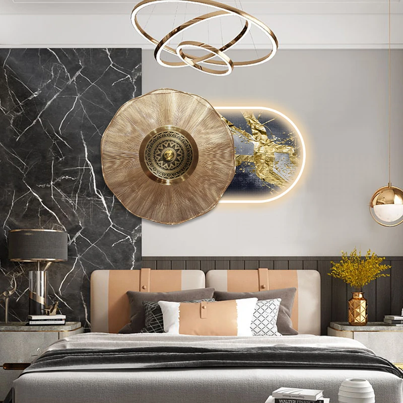 美しい風景の現代的なラグジュアリーリビングルーム装飾画、寝室の壁にぴったりな円形LEDライト付きメタルアートパネル。魅力的なデザインで、空間を一層引き立てます!