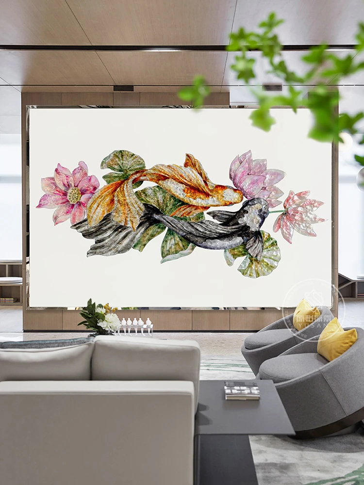 ラグジュアリーサロンの背景にぴったり!ダイヤモンド装飾の貝殻模様とカラフルなラメが美しい、飲食店に最適な「連年有余」の壁掛けアート。豪華さと華やかさで、空間をムードアップ!